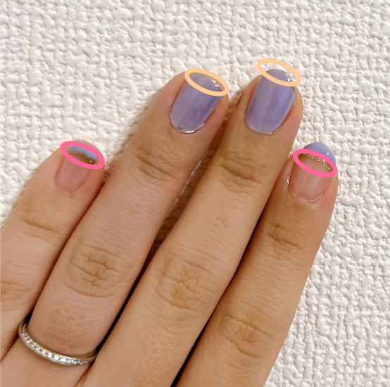 まずは、親指以外の4本に好きな色でベースカラーを塗ってください。1度硬化をして、中指や薬指にLavender BLUEを塗ります。
