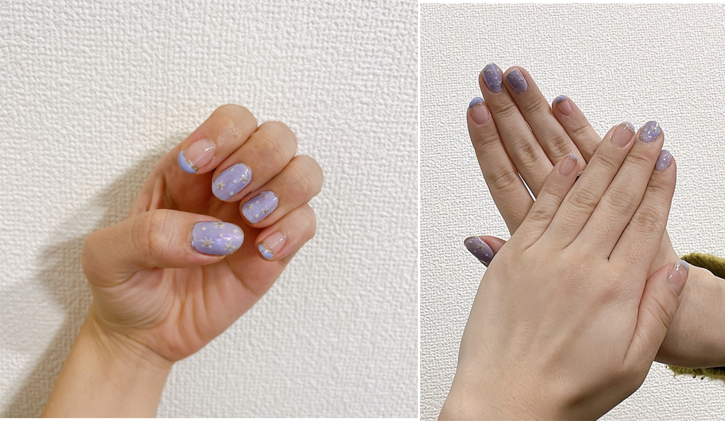 同時に、中指と薬指のLavender BLUEの上からMystic PURPLEを塗ります。Mystic PURPLEを追加することで、少しきらめきが出てさらに綺麗に見えますよ!