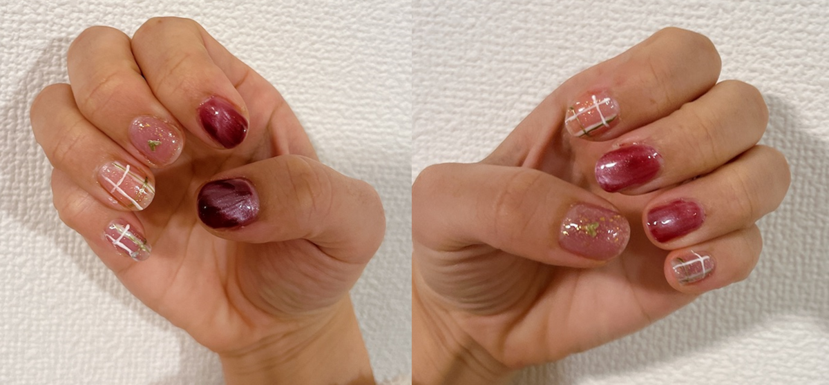 今回のバレンタインネイルは、マグネットネイル・ハートネイル・チェックネイルの3種類を取り入れました。