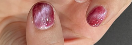 ピンクの色は、濃い目で2度塗りすると赤紫に近い色になります。磁石の近づけ方を変えることによって色の出方も変わりますので、とっても面白いネイルカラーです。
