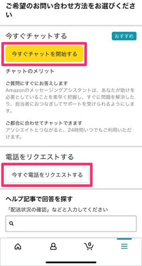 Amazonカスタマーサービスへは、電話かチャットで日本語での問い合わせ24時間365日可能です。