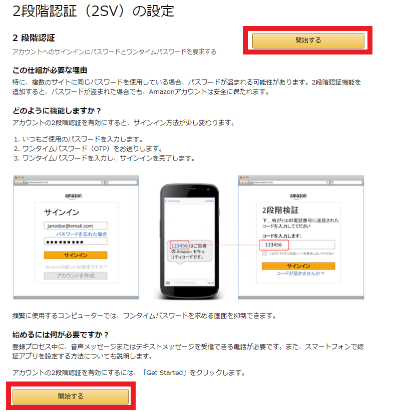 まず「2段階認証の設定」のページを開きます。Amazonのページ上部にある「アカウント&リスト」にカーソルを合わせると、「アカウントサービス」が選べます。そこに「ログインとセキュリティ」とあるので、クリックしてください。開いたページで「2段階認証の設定」の「オンにする」または「編集」をクリックすると、下の画像のようなページが開きます。