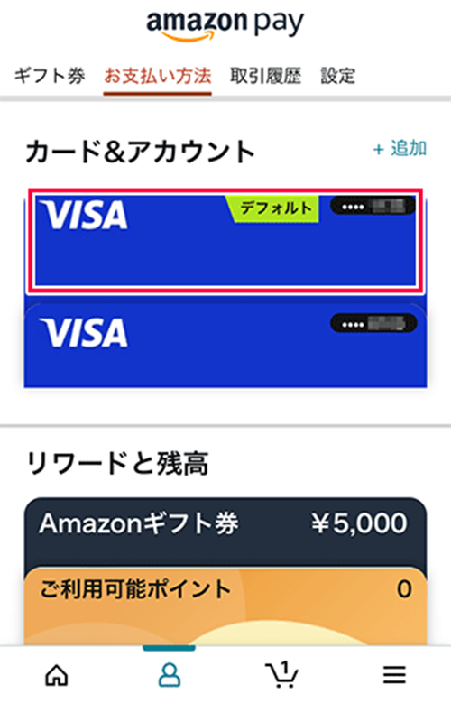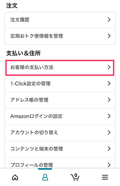 クレジットカードの消去を行うには、Amazonの画面下部のアカウントアイコン、アカウントサービスの順番にメニューをタップしてください。そして、お客様のお支払い方法をタップします。