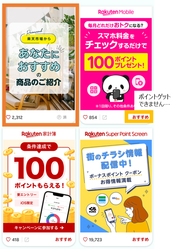 アプリを開くと、様々な広告が表示されます。その中のPマークをタップするとポイントを貯めることができます。(オレンジ枠)ポイントゲット済みのものは、画像のように済と表示されます。
